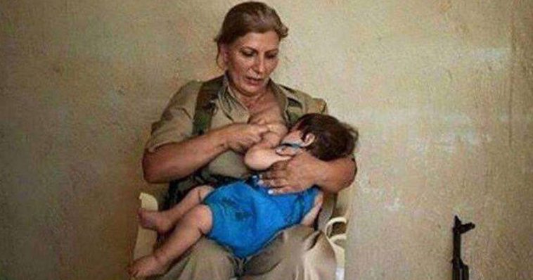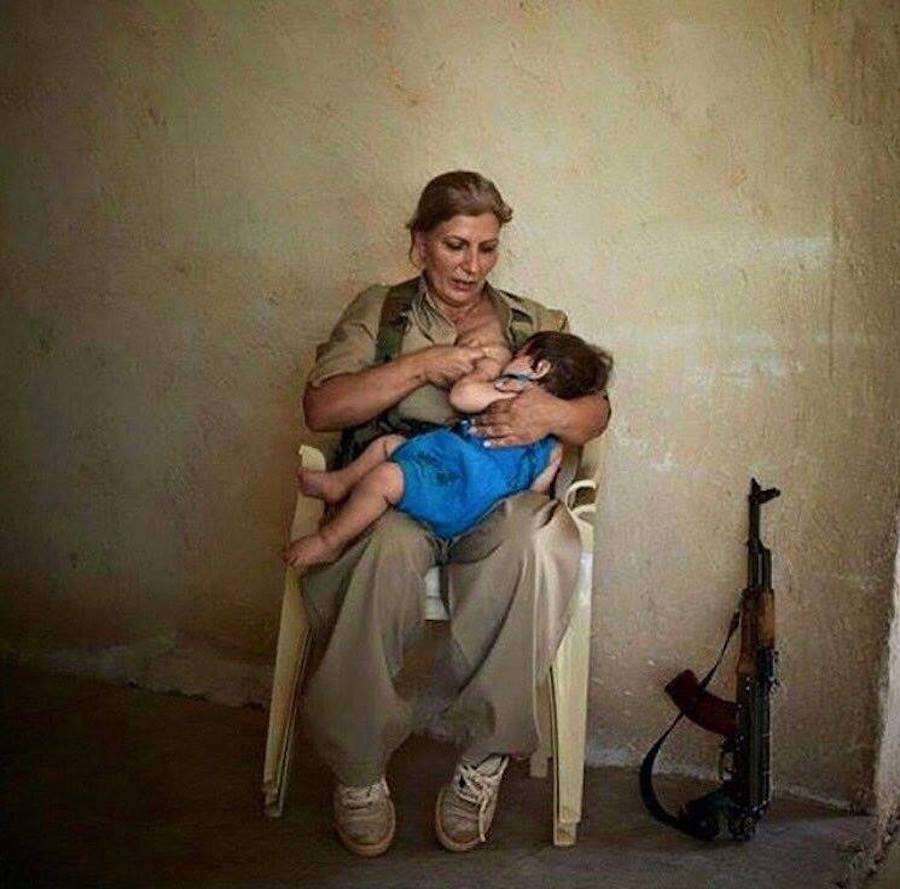 Μια γυναίκα θηλάζει το παιδί της, έχοντας δίπλα της το όπλο της… Αυτοί είναι οι Κούρδοι.