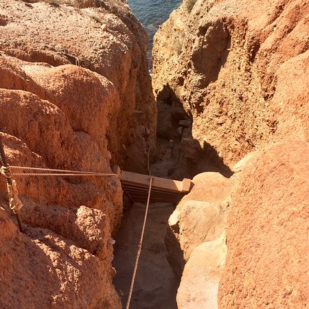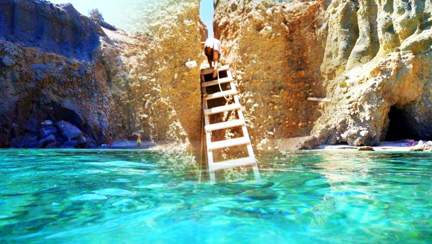 Μια πινακίδα στη κορυφή σε προειδοποιεί ότι αν θες να κατέβεις στη παραλία, θα το κάνεις με δική σου ευθύνη. Πρόκειται για έναν εξαιρετικά απότομο βράχο, τον οποίο κατεβαίνεις από μία ξύλινη σκάλα που κρέμεται μόνο με ένα σχοινί.