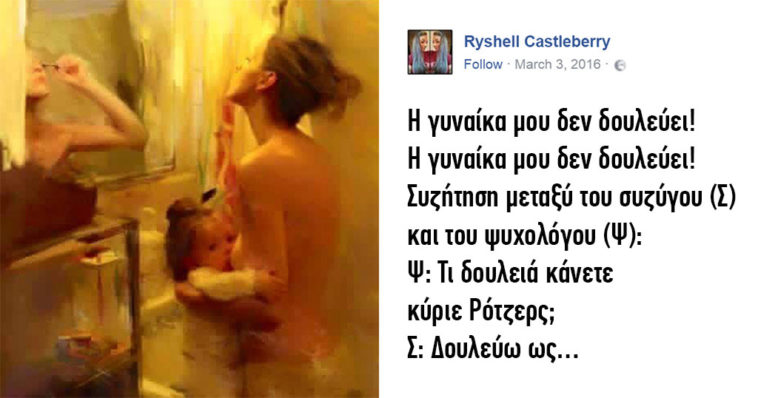 Κουρασμένη με το να ακούει συνέχεια την φράση “μα καλά τι κάνεις όλη μέρα”, η καλλιτέχνης τατουάζ Ryshell Castleberry με βάση την Φλόριντα αποφάσισε να γράψει ένα αφιέρωμα μέσω Facebook για όλες τις μαμάδες που μένουν στο σπίτι. Η πολύ δυνατή της ανάρτηση πήρε πάνω από 640.000 likes και 300.000 κοινοποιήσεις. Το κείμενο αυτό πρέπει να διαβαστεί από όλους για να εκτιμήσουν πραγματικά όλες τις θυσίες που κάνουν οι μαμάδες αυτές για χάρη των παιδιών τους.