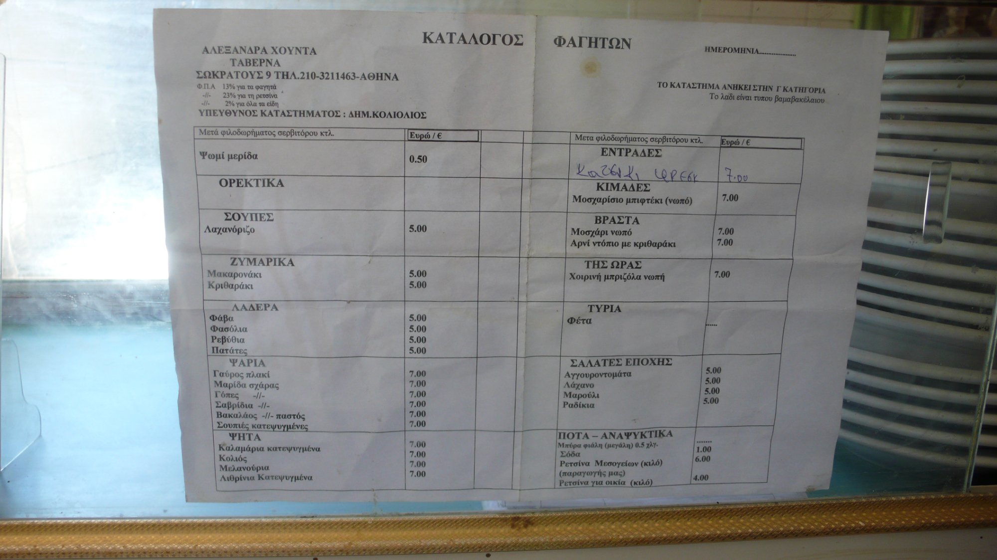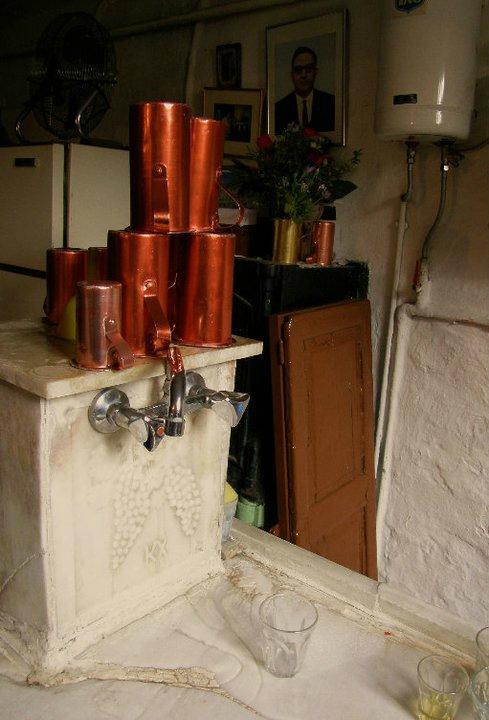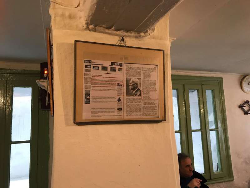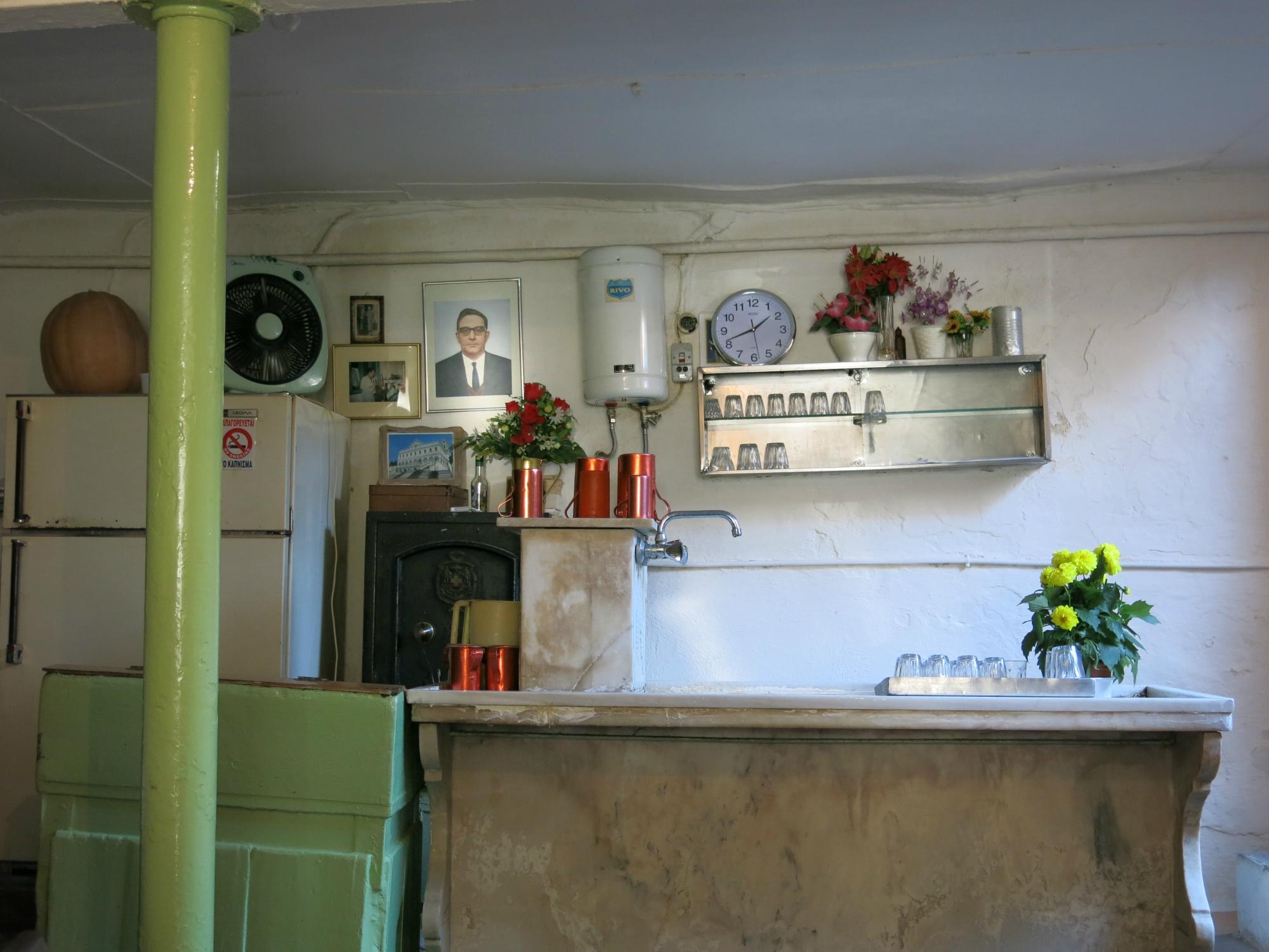 Ξεχωρίζει ο μαρμάρινος νεροχύτης το βάθος του μαγαζιού και στο στο τραπέζι σου θα βρείς κομμάτια χαρτιού αντί για χαρτοπετσέτες. Στις κολώνες κάδρα με αποκόμματα από παλιές εφημερίδες και ποιήματα του Κώστα Βάρναλη γιατί σε αυτό το μαγαζί σύχναζε και εκεί, λέγεται, εμπνεύστηκε μερικά από τα ποιήματα του.