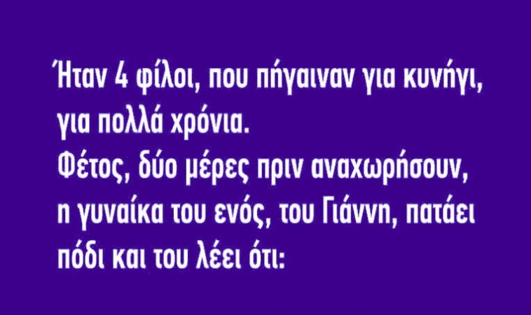 Ήταν 4 φίλοι, που πήγαιναν για κυνήγι, για πολλά χρόνια. Φέτος, δύο μέρες πριν αναχωρήσουν, η γυναίκα του ενός, του Γιάννη, πατάει πόδι και του λέει ότι: δεν θα πας!