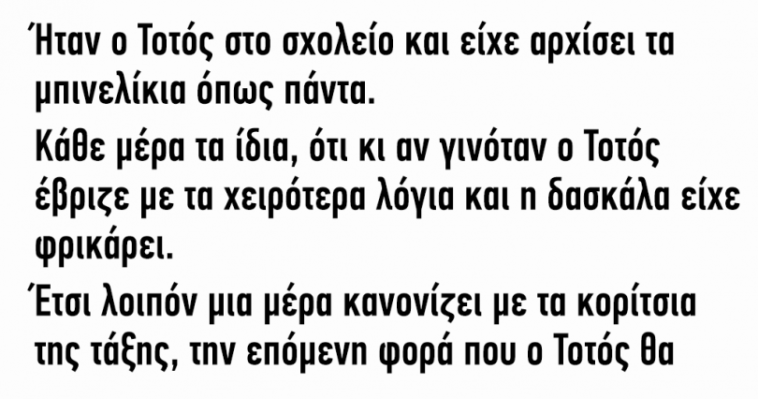Ήταν λοιπόν ο Τοτός στο σχολείο και είχε αρχίσει τα μπινελίκια όπως πάντα. Κάθε μέρα τα ίδια, ότι κι αν γινόταν ο Τοτός έβριζε με τα χειρότερα λόγια και η δασκάλα είχε φρικάρει. Το ίδιο βέβαια και τα κορίτσια της τάξης σαν πιό σεμνά που ήταν.
