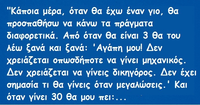 “Κάποια μέρα, όταν θα έχω έναν γιο, θα προσπαθήσω να κάνω ακριβώς το αντίθετο από όλους τους άλλους. Από όταν θα είναι 3 θα αρχίσω να του λέω ξανά και ξανά: “Αγάπη μου! Δεν χρειάζεται οπωσδήποτε να γίνει μηχανικός. Δεν χρειάζεται να γίνεις δικηγόρος. Δεν έχει σημασία τι θα γίνεις όταν μεγαλώσεις.