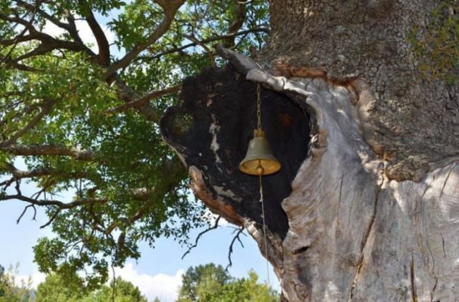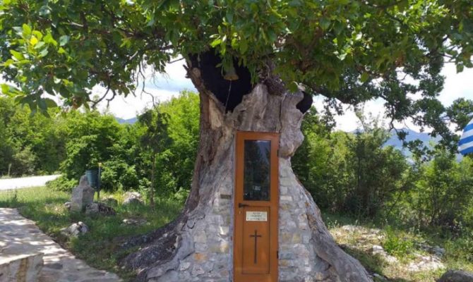 Το αδύναμο ευλογημένο δέντρο θωρακίστηκε εσωτερικά με πέτρα από την περιοχή και μετατράπηκε σε Δεντροκκλησιά.