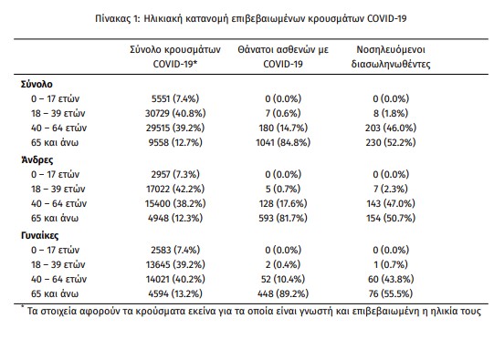 Η μέση ηλικία των κρουσμάτων είναι 41 έτη (εύρος 0 έως 104 ετών), ενώ η μέση ηλικία των θανάτων είναι 80 έτη (εύρος 25 έως 103 ετών). Η ηλικιακή κατανομή των (α) συνολικών κρουσμάτων, (β) των περιστατικών που κατέληξαν σε θάνατο και (γ) των ασθενών που νοσηλεύονται διασωληνωμένοι, είναι η ακόλουθη: