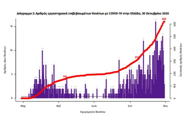 Οι νέοι θάνατοι ασθενών με COVID-19 είναι 5, ενώ από την έναρξη της επιδημίας έχουν καταγραφεί συνολικά 620 θάνατοι.Η διάμεση ηλικία των ασθενών που απεβίωσαν είναι 79 έτη. Ο αριθμός των ασθενών που νοσηλεύονται διασωληνωμένοι είναι 128 (71.1% άνδρες).