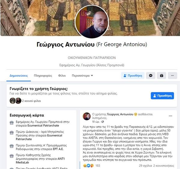 Στην ανάρτησή του, ο πατήρ Αντώνιος αναφέρει: «Λίγο πριν απο τις 11 το βράδυ της Παρασκευής 4/12, με ειδοποίησαν να μνημονεύσω έναν “ήσυχο γίγαντα”, μόλις 50 χρόνων, δάσκαλο, με δύο ανήλικα παιδιά. Έφυγε μόνος στη ΜΕΘ του ΑΧΕΠΑ, νικημένος απο τον κορωνοϊό. Τον έλεγαν Γιώργο και δεν είχε υποκείμενα νοσήματα.