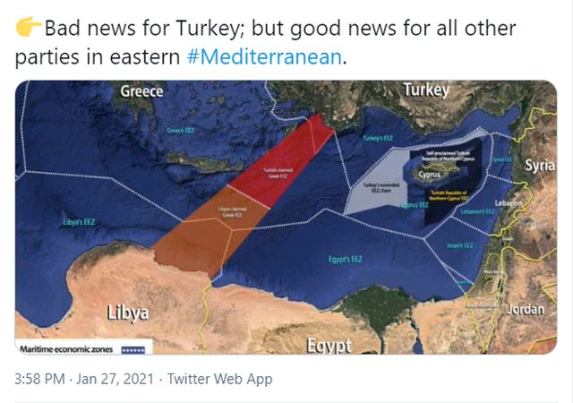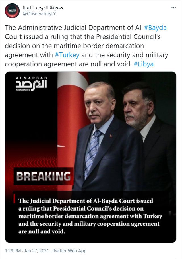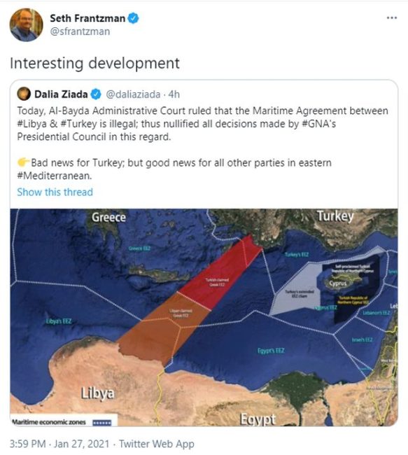 Να σημειωθεί ότι οι δύο έκνομες συμφωνίες της Τουρκίας με την ισλαμιστική κυβέρνηση της Τρίπολης έχουν κηρυχθεί από πέρσι τον Ιανουάριο άκυρες και έκνομες από τη Βουλή των Αντιπροσώπων της Λιβύης.