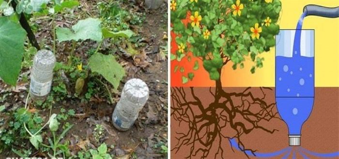 Κόψτε τη βάση του και κάντε μια τρύπα στη γλάστρα ή στο έδαφος δίπλα από το φυτό σας, όταν είναι ακόμα μικρό ή πριν το φυτέψετε και τοποθετήστε το ανάποδα με το καπάκι προς τα κάτω. Αφήστε το πάνω μέρος εκτεθειμένο και εφαρμόστε ένα χωνί ώστε να το γεμίζετε εύκολα με νερό.