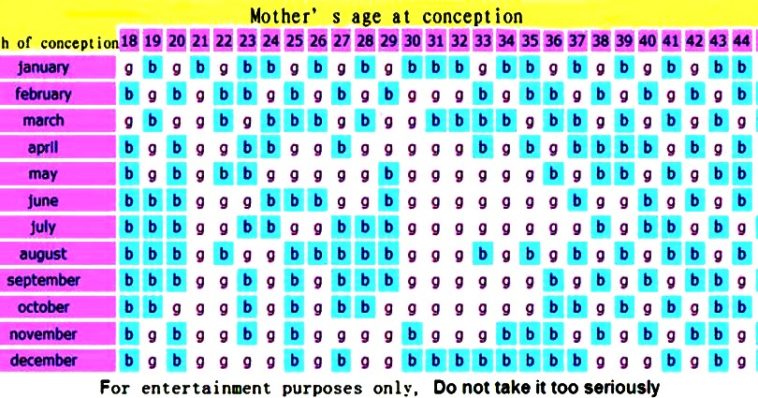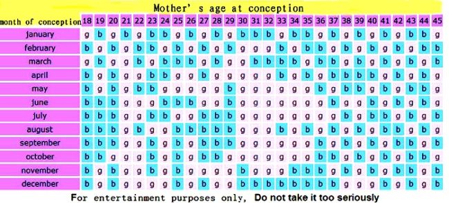 Το γράμμα (Β) σημαίνει αγόρι και το γράμμα (G) σημαίνει κορίτσι στο διάγραμμα. Με λίγα λόγια λοιπόν βρείτε την ηλικία σας και το μήνα της σύλληψης και ανακαλύψτε αν το μωράκι που κουβαλάτε είναι αγόρι ή κορίτσι.