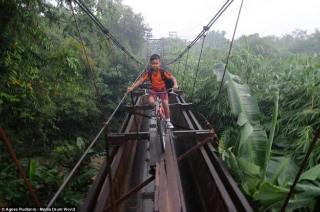 Οι μαθητές αναγκάζονται να διασχίσουν μια άκρως επικίνδυνη γέφυρα, η οποία έχει μήκος 30 μέτρα, προκειμένου να γλιτώσουν την διαδρομή μέσα από τη ζούγκλα.