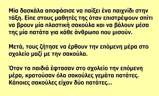 Μία δασκάλα αποφάσισε να παίξει ένα παιχνίδι στην τάξη. Είπε στους μαθητές της όταν επιστρέψουν σπίτι να βρουν μία πλαστική σακούλα και να βάλουν μέσα της μία πατάτα για κάθε άνθρωπο που μισούν. Μετά τους ζήτησε να έρθουν την επόμενη μέρα στο σχολείο μαζί με την σακούλα.