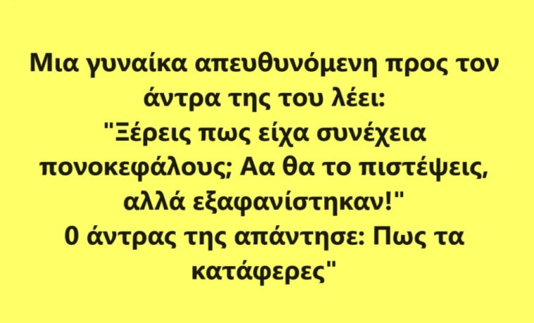 Μια γυναίκα απευθυνόμενη προς τον άντρα της του λέει: «Ξέρεις πως είχα συνέχεια πονοκεφάλους; Δε θα το πιστέψεις, αλλά εξαφανίστηκαν!»