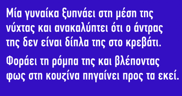 Μία γυναίκα ξυπνάει στη μέση της νύχτας και ανακαλύπτει ότι ο άντρας της δεν είναι στο κρεβάτι.