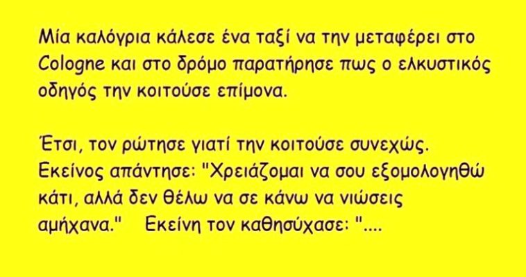 Μία καλόγρια κάλεσε ένα ταξί να την μεταφέρει στο Cologne και στο δρόμο παρατήρησε πως ο ελκυστικός οδηγός την κοιτούσε επίμονα. Έτσι, τον ρώτησε γιατί την κοιτούσε συνεχώς. Εκείνος απάντησε: «Χρειάζομαι να σου εξομολογηθώ κάτι, αλλά δεν θέλω να σε κάνω να νιώσεις αμήχανα.»