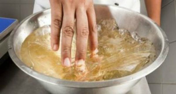 – Το βράδυ, ρίξτε 5 γρ ζελατίνη (σε δύο επίπεδα κουταλάκια του γλυκού) και ένα τέταρτο φλιτζάνι κρύο (από το ψυγείο) νερό.