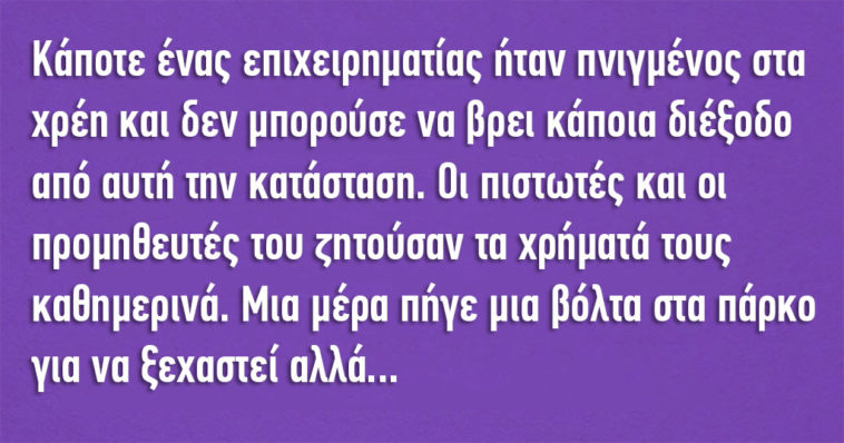 Κάποτε ένας επιχειρηματίας ήταν πνιγμένος στα χρέη και δεν μπορούσε να βρει κάποια διέξοδο από αυτή την κατάσταση. Οι πιστωτές και οι προμηθευτές του ζητούσαν τα χρήματά τους καθημερινά.