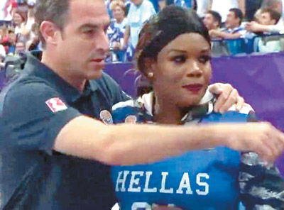 Ξαφνικά, στον πάγκο της Εθνικής μας ομάδας εμφανίζεται η Βερόνικα Ατεντοκούμπο, η μητέρα του η οποία αγωνιώντας προσπαθεί να δει αν ο γιος της έχει χτυπήσει σοβαρά. Οι παράγοντες την καθησυχάζουν πως όλα είναι καλά, την ηρεμούν και την απομακρύνουν από το παρκέ. Εκείνη αποσύρεται διακριτικά δίχως να παίρνει το βλέμμα της από πάνω του. Δεν στρέφει την πλάτη σαν να θέλει να τσεκάρει με τα ίδια της τα μάτια αν όντως ο Θανάσης είναι καλά.