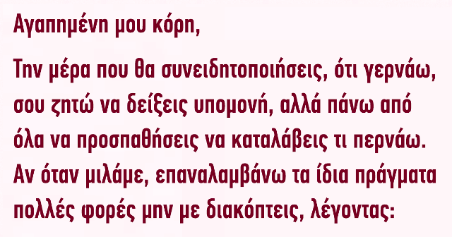 Την μέρα που θα συνειδητοποιήσεις, ότι γερνάω, σου ζητώ να δείξεις υπομονή, αλλά πάνω από όλα να προσπαθήσεις να καταλάβεις τι περνάω.