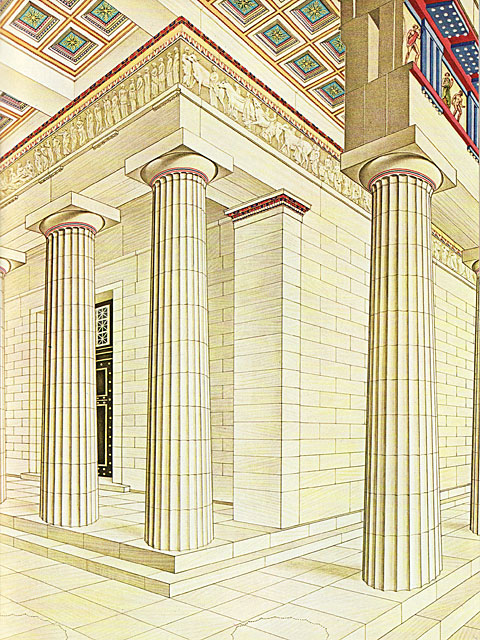 Και το τρίτο εντοπίζεται στις κολώνες του κτίσματος, οι οποίες δεν τοποθετήθηκαν μονοκόμματες, αφού οι αρχαίοι Έλληνες ήξεραν πως για να αντέξουν στους κραδασμούς της γης, θα έπρεπε να τοποθετηθούν σε φέτες, τέλεια εφαρμοσμένες η μία πάνω στην άλλη.
