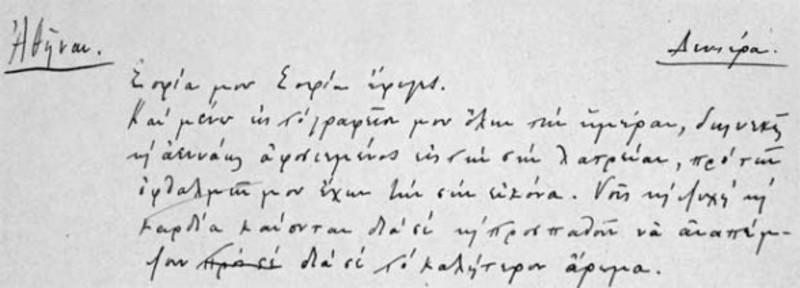 Πέρασε η νύχτα. Είναι η ώρα που έπαιρνα το τραμ από την Καλλιθέα για να σε συναντήσω στην Ακρόπολη. Με το νου μου σε παρακολουθώ να πηγαίνεις εκεί μόνος. Ζηλεύω τα αγαπημένα μάρμαρα που πατάς. Πες τους ότι δεν θα αργήσω να γυρίσω. Πάντα δική σου, Σοφία». Αλλά ο ανυπόμονος συγγραφέας δεν περίμενε την αγαπημένη του να γυρίσει. Μια μέρα, η Σοφία τον είδε να ξεπροβάλλει μπροστά της, βρώμικο και σκονισμένο.