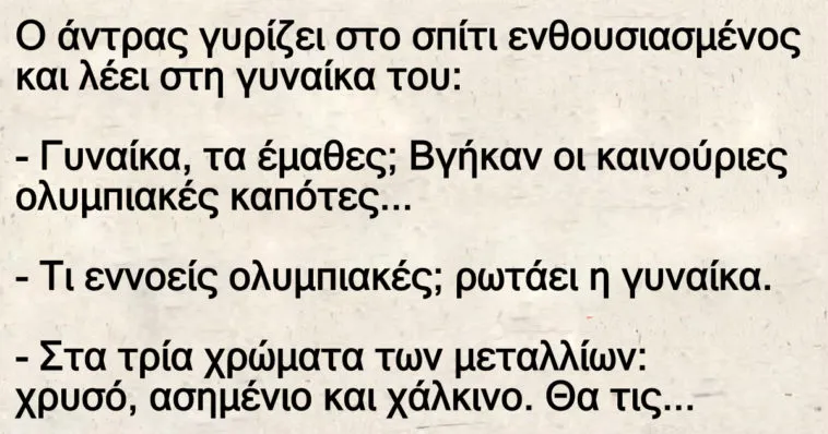 – Γυναίκα, τα έμαθες; Βγήκαν οι καινούριες ολυμπιακές κα πότες…