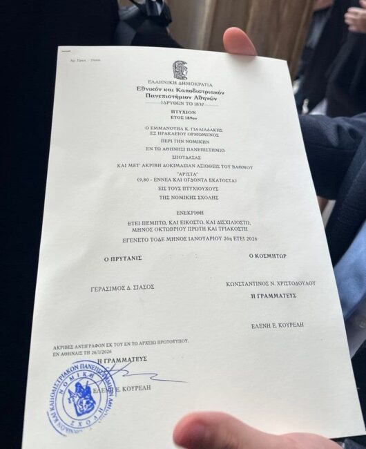Ο Μάνος Γιαλιαδάκης, με καταγωγή από το Κεφαλοβρύσι του Δήμου Βιάννου, ορκίστηκε πρόσφατα και πλέον είναι ασκούμενος δικηγόρος. Το όνομά του, ωστόσο, έχει ήδη γραφτεί στην ιστορία της Νομικής Αθηνών, καθώς –σύμφωνα με πληροφορίες από τη γραμματεία της σχολής– δεν θυμούνται να έχει αποφοιτήσει άλλος φοιτητής με υψηλότερο βαθμό τις τελευταίες δεκαετίες.
