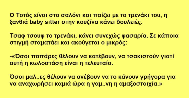 O Τοτός είναι στο σαλόνι και παίζει με το τρενάκι του, η ξανθιά baby sitter στην κουζίνα κάνει δουλειές. Τσαφ τσουφ το τρενάκι, κάνει συνεχώς φασαρία. Σε κάποια στιγμή σταματάει και ακούγεται ο μικρός: