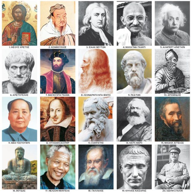 Στη δεύτερη θέση ακολουθεί ο Κινέζος διανοητής και κοινωνικός φιλόσοφος Κομφούκιος (551-479 π.Χ.), η διδασκαλία του οποίου έχει επηρεάσει βαθύτατα τη σκέψη της ανατολικής Ασίας, και στην τρίτη ο Βρετανός φυσικός σερ Ισαάκ Νεύτων (1643-1727), που ανακάλυψε τον νόμο της βαρύτητας. Ο Ινδός πολιτικός και ακτιβιστής Μαχάτμα Γκάντι και ο Γερμανός φυσικός Αλμπερτ Αϊνστάιν, που διατύπωσε τη θεωρία της σχετικότητας, συμπληρώνουν την πρώτη πεντάδα.