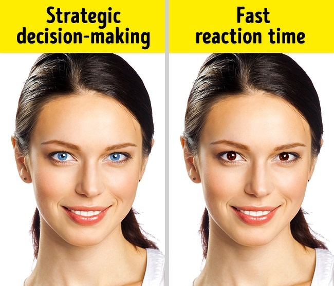 Τα άτομα με ανοιχτόχρωμα μάτια μπορούν να χειριστούν δύσκολες καταστάσεις, παίρνοντας το χρόνο τους να συγκεντρωθούν και να πάρουν μια λογική απόφαση, ενώ οι άνθρωποι με σκούρα μάτια δείχνουν εξαιρετικά αποτελέσματα όταν απαιτείται γρήγορος χρόνος αντίδρασης.