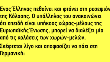 in Αστεία Ένας Έλληνας πεθαίνει και φτάνει στη ρεσεψιόν της Κόλασης και ο υπάλληλος του ανακοινώνει ότι επειδή είναι υπήκοος χώρας μέλους της Ευρωπαϊκής Ένωσης, μπορεί να διαλέξει μία από τις κολάσεις των χωρών-μελών.