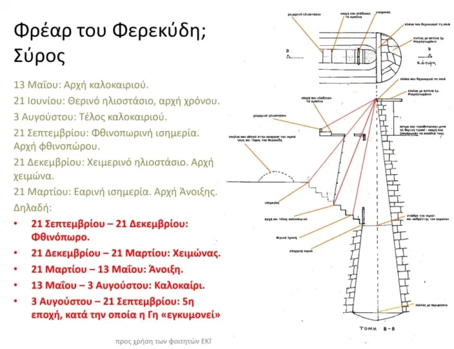 Πώς το αντιλήφθηκε αυτό ο επίμονος Συριανός; Έπρεπε να περάσουν κι άλλα χρόνια επίμονων ερευνών… Ο ίδιος έμεινε μέσα σε αυτό αρκετές ημέρες και νύχτες, σε διάφορες εποχές του χρόνου και με τις καταγραφές που έκανε έφτασε στο συμπέρασμα ότι ολόκληρη η κατασκευή του πηγαδιού ήταν ένα… μεγάλο ηλιοτρόπιο, δηλαδή κάτι σαν «ηλιακό ημερολόγιο»!