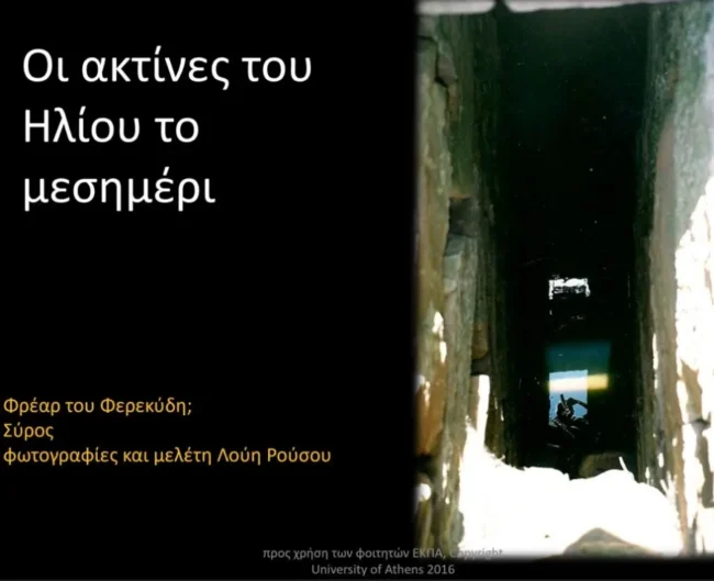 Ο Λούης Ρούσσος θεωρεί πως από τις βραχογραφίες αποκρυπτογράφησε τα σύμβολα του ηλίου κι άλλων πλανητών, καθώς και άλλα στοιχεία «που υπάρχουν στη Γη». Τα σύμβολα «έδειχναν» προς ένα συγκεκριμένο σημείο, στην άλλη πλευρά του νησιού: Σε ένα πανάρχαιο πηγάδι, το Φρέαρ του Φερεκύδη, όπως ονομάστηκε αργότερα, που πήρε το όνομά του από τον σπουδαίο Φιλόσοφο της Σύρου, ο οποίος ήταν κοσμολόγος και δάσκαλος του Πυθαγόρα.