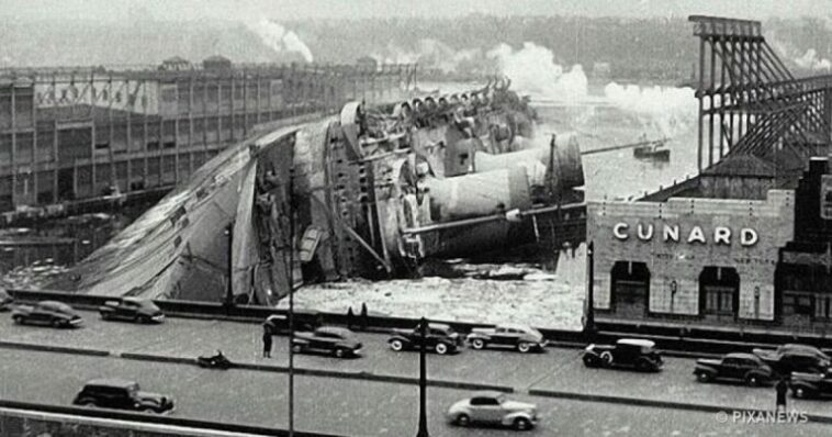 Κατάρρευση του διατλαντικού πλοίου «Normandie» στην προβλήτα της Νέας Υόρκης, 9 Φεβρουαρίου 1942.