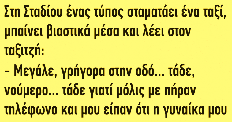 – Μεγάλε,γρήγορα στην οδό… τάδε, νούμερο… τάδε γιατί μόλις με πήραν τηλέφωνο και μου είπαν ότι η γυναίκα μου με απατάει! Πράγματι,ο ταξιτζής πατάει γκάζι και σε λίγο φτάνουν στο σπίτι…