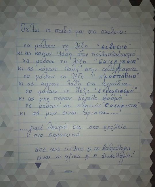 Όπως καταλαβαίνουμε κι από το ποστ που έκανε στη σελίδα του στο Facebook, η ποιότητα στη ζωή ενός παιδιού δεν είναι μόνο το φαγητό και τα ρούχα – ούτε μόνο οι βαθμοί και οι σπουδαίες επιδόσεις. Το σημαντικότερο για ένα παιδί είναι το χαμόγελο, η ασφάλεια και το παράθυρο στη γνώση!