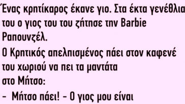 in Αστεία Ένας κρητίκαρος έκανε γιο. Στα έκτα γενέθλια του ο γιος του του ζήτησε την barbie rapounzel. Ο Κρητικός απελπισμένος πάει στον καφενέ του χωριού να πει τα μαντάτα στο Μήτσο.