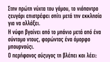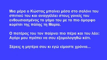 in Αστεία Μια μέρα ο Κώστας μπαίνει μέσα στο σαλόνι του σπιτιού του και αναγγέλλει στους γονείς του ενθουσιασμένος το γάμο του με το πιο όμορφο κορίτσι της πόλης τη Μαρία.