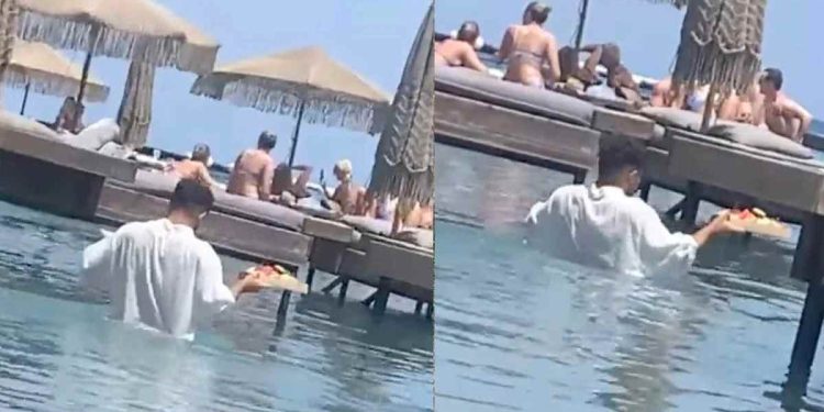 Οι φωτογραφίες και τα βίντεο που έχουν αναρτηθεί στα social media προκαλούν οργή. Όπως φαίνεται, ο σερβιτόρος κρατώντας τον δίσκο με τα φαγητά μπαίνει στη θάλασσα, με το νερό να φτάνει περίπου έως τον λαιμό ώστε να παραδώσει την παραγγελία στους λουόμενους, οι οποίοι βρίσκονται πάνω σε ξύλινη πλατφόρμα.