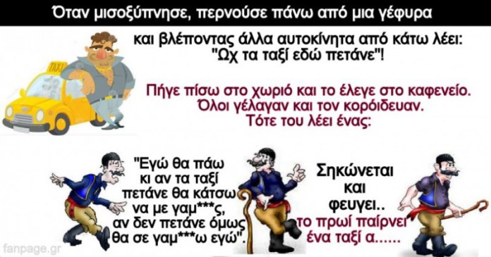 Όμως εκείνος επέμενε. Τότε του λέει ένας: «Εγώ θα πάω το Σάββατο στην Αθήνα σε μια κουμπαριά, κι αν τα ταξί πετάνε θα κάτσω να με γαμ *** ς, αν δεν πετάνε όμως θα σε γαμ *** ω εγώ “.