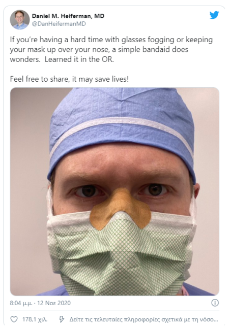 Ο Δρ Ντάνιελ Χάιφμαν, νευροχειρουργός στο Semmes Murphey Neurologic & Spine Institute στο Μέμφις, έγραψε στο Twitter την περασμένη εβδομάδα, «Αν σας δυσκολεύουν τα γυαλιά που θολώνουν ή το να κρατάτε τη μάσκα πάνω από τη μύτη σας, ένα απλό αυτοκόλλητο επίθεμα (τύπου hansaplast) κάνει θαύματα».