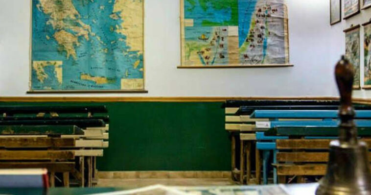 Η σχολική αίθουσα με τα ξύλινα θρανία – όταν υπήρχε σχολείο και δεν ήταν ερείπια λόγω των πολέμων – ένα παλιό κουδούνι, οι τοίχοι καλυμμένοι με χάρτες μυθολογίας, γεωγραφίας…