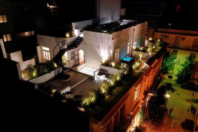Στο εσωτερικό του ανακαλύπτεις έναν ξεχωριστό προορισμό, γεμάτο ιστορία και αίγλη, όπου η εμπειρία του θα εμπλουτιστεί μέσα στις 6 μοναδικά διαμορφωμένες σουίτες, την αυλή και το Rooftop bar με τη μοναδικής αξίας θέα στον Λυκαβηττό.
