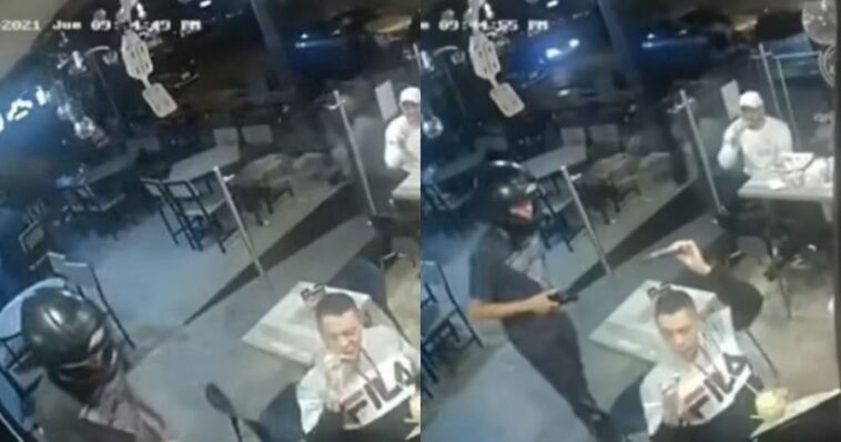 Τα βίντεο από τις κάμερες ασφαλείας δείχνουν ότι ο άντρας άρχισε να τρώει τις φτερούγες κοτόπουλο σε ένα εστιατόριο λίγο πριν εμφανιστεί ένας άλλος άνδρας που φορά κράνος και κρατά όπλο.