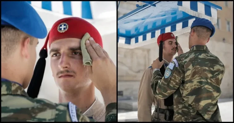 Οι Εύζωνες δεν λυγίζουν από την ανυπόφορη θερμοκρασία και στέκονται αγέρωχοι και αμετακίνητοι στην πλατεία Συντάγματος.