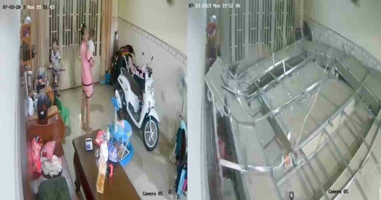 Μια μητέρα στην Καμπότζη ενήργησε γρήγορα και έσωσε το παιδί της δευτερόλεπτα πριν καταρρεύσει η οροφή του σπιτιού της – και το κατέγραψε η κάμερα.