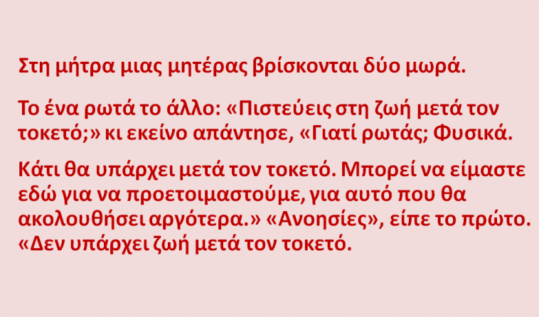 Στη μήτρα μιας μητέρας βρίσκονται δύο μωρά. Το ένα ρωτά το άλλο: «Πιστεύεις στη ζωή μετά τον τοκετό;» κι εκείνο απάντησε, «Γιατί ρωτάς; Φυσικά.